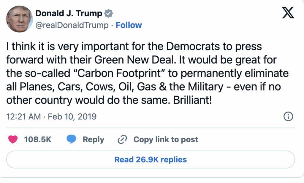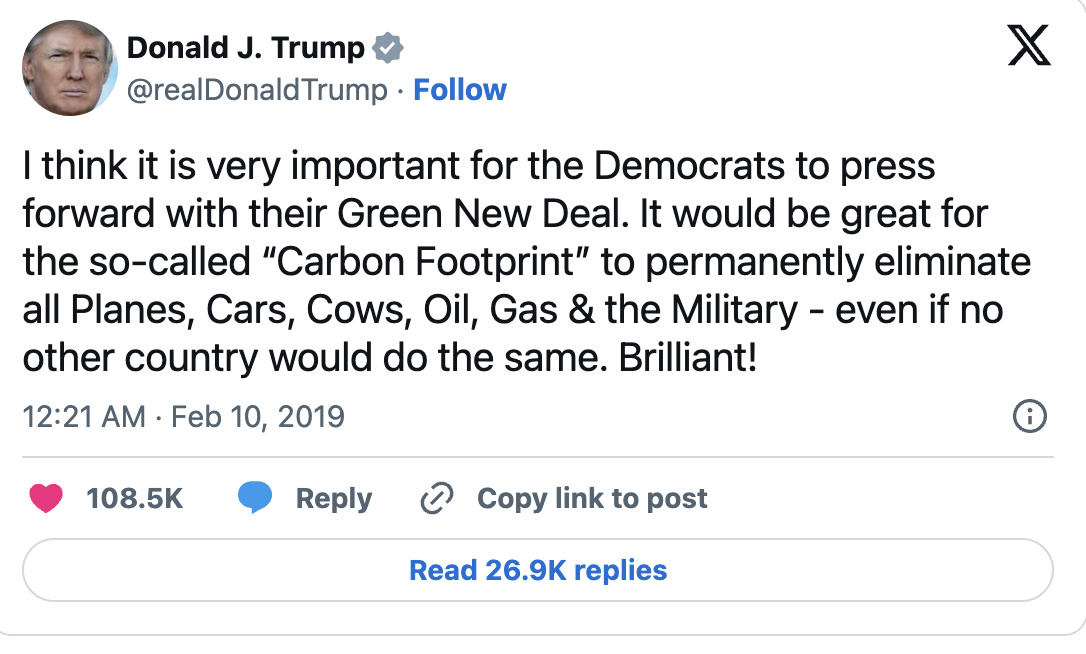 Yet Trump’s tweet was actually on the money in more ways than one. Environmental measures, and solutions to climate change, often appear (or are talked about) as programs of austerity. To reduce “our” impact “we” need to consume less: eat less meat, walk and not drive, fly less, buy less fast fashion, and so on.
